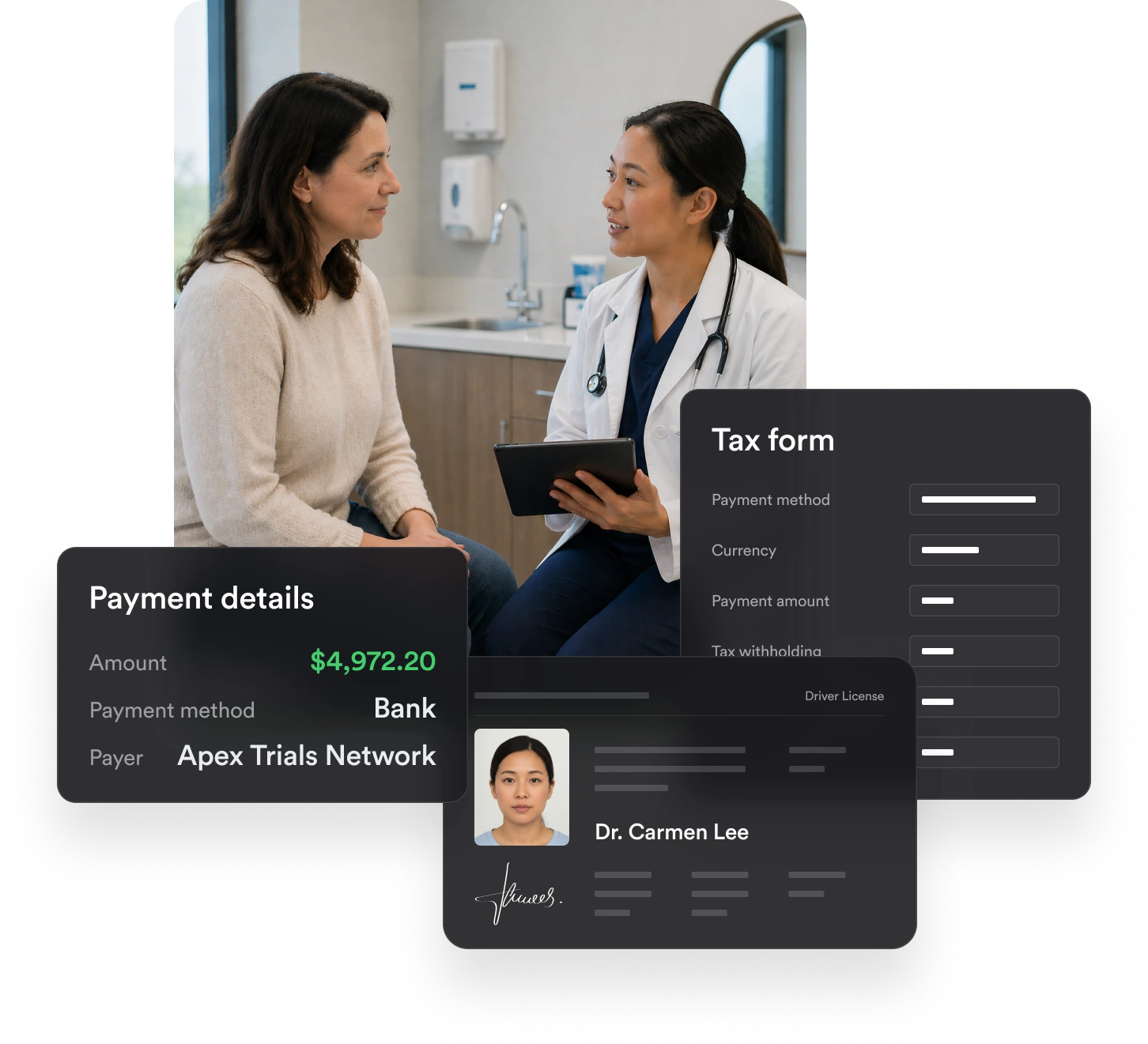 Verify HCPs and trial participants with native identity checks and real-time screening. Reduce fraud risk, protect trial integrity, and ensure every payment goes to a verified individual.